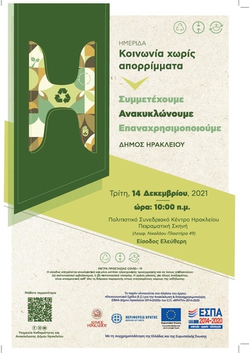 Ενημερωτική Ημερίδα με θέμα «Κοινωνία χωρίς απορρίμματα: Συμμετέχουμε, Ανακυκλώνουμε, Επαναχρησιμοποιούμε» διοργανώνει ο Δήμος Ηρακλείου στο Πολιτιστικό Συνεδριακό Κέντρο Ηρακλείου - Πειραματική Σκηνή, την Τρίτη 14 Δεκεμβρίου και ώρα 10:00 π.μ.