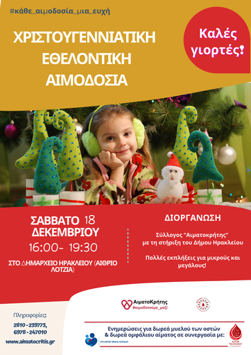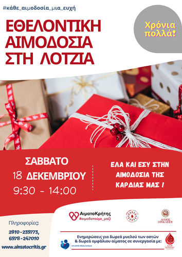 Εθελοντική Αιμοδοσία θα πραγματοποιηθεί το Σάββατο 18.12.2021 στο κέντρο της πόλης του Ηρακλείου (στο Αίθριο της Λότζια), από τις 09:00 έως τις 13:30 και το απόγευμα από τις 16:00-19:30 , με δράσεις για μαθητές και πολλές εκπλήξεις για μικρούς και μεγάλους.