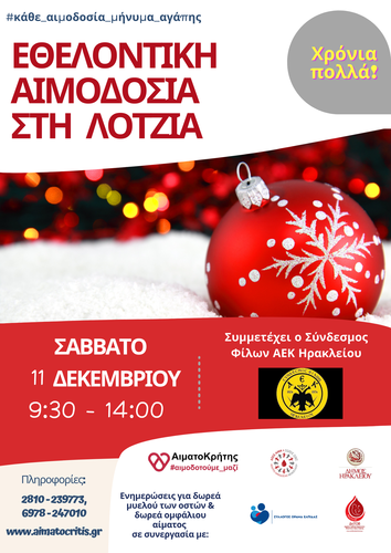 Εθελοντική Αιμοδοσία θα πραγματοποιηθεί το Σάββατο 11.12.2021 στο κέντρο της πόλης του Ηρακλείου (στο Αίθριο της Λότζια), από τις 09:00 έως τις 13:30. Πρόκειται για μια κοινή προσπάθεια αιμοδοσίας, την οποία διοργανώνει ο Παγκρήτιος Σύνδεσμος Εθελοντών Αιμοδοτών και Δωρητών Οργάνων Σώματος «Αιματοκρήτης» σε συνεργασία με τον Δήμο Ηρακλείου και την Αντιδημαρχία Πολιτισμού – Εθελοντισμού. Στην αιμοδοσία του Σαββάτου θα συμμετέχει ο Σύνδεσμος Φίλων ΑΕΚ Ηρακλείου.