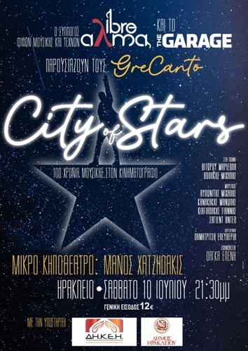 Στο πλαίσιο των εκδηλώσεων «Ηράκλειο- Καλοκαίρι 2021» παρουσιάζεται το μιούζικαλ «City of Stars» το Σάββατο 10 Ιουλίου στο κηποθέατρο «Μάνος Χατζιδάκις».