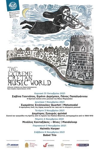 Το Πολιτιστικό Συνεδριακό Κέντρο Ηρακλείου, μετά την απόλυτη επιτυχία του πρόσφατου Φεστιβάλ Τζαζ και τις sold out πρώτες εκδηλώσεις της τρέχουσας καλλιτεχνικής περιόδου, παρουσιάζει το Etreme Cretan Music World Festival, ένα φεστιβάλ αφιερωμένο στην εξέλιξη της παραδοσιακής κρητικής μουσικής, όπως αυτή διαμορφώνεται μέσα από την αλληλεπίδραση των σύγχρονων ερμηνευτών της με διαφορετικά είδη μουσικής δημιουργίας από όλο τον κόσμο.