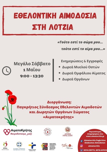 Εθελοντική Αιμοδοσία θα πραγματοποιηθεί το M. Σάββατο 01.05.2021 στο κέντρο της πόλης του Ηρακλείου (στο Αίθριο της Λότζια), από τις 09:00 έως τις 13:30. Πρόκειται για μια κοινή προσπάθεια αιμοδοσίας, την οποία συντονίζουν: