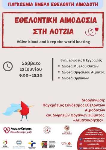 Εθελοντική Αιμοδοσία θα πραγματοποιηθεί το Σάββατο 12.06.2021 στο κέντρο της πόλης του Ηρακλείου (στο Αίθριο της Λότζια), από τις 09:00 έως τις 13:30. Πρόκειται για μια κοινή προσπάθεια αιμοδοσίας, την οποία συντονίζουν: