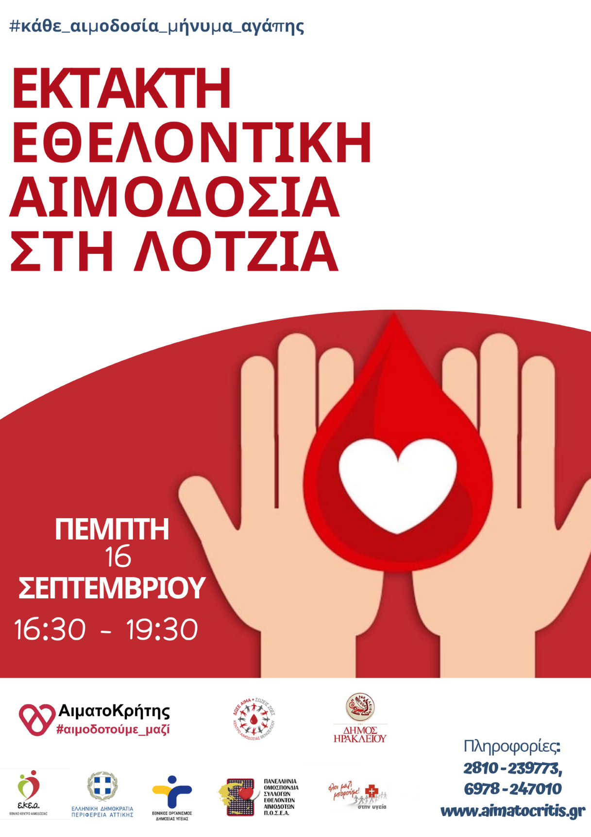 Έκτακτη Εθελοντική Αιμοδοσία, λόγω των αυξημένων αναγκών αίματος που υπάρχουν, θα πραγματοποιηθεί την Πέμπτη 16.09.2021 στο κέντρο της πόλης του Ηρακλείου (στο Αίθριο της Λότζια),  από τις 16:30 έως τις 19:30.  Πρόκειται για μια κοινή προσπάθεια αιμοδοσίας, την οποία συντονίζουν: