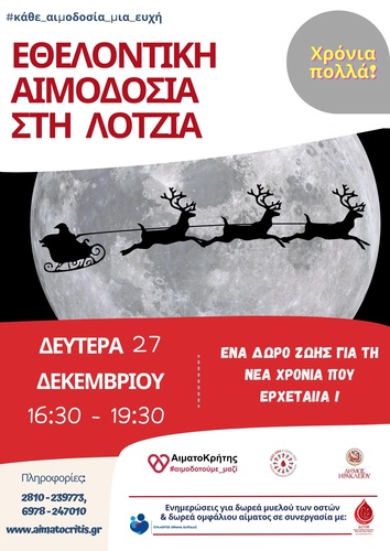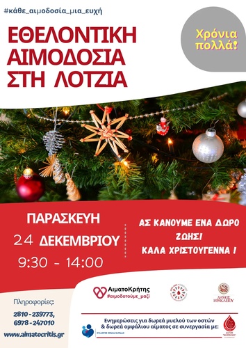Εθελοντική αιμοδοσία θα πραγματοποιηθεί την Παρασκευή 24.12.2021 στο κέντρο της πόλης του Ηρακλείου στο Αίθριο της Λότζια, από τις 09:30 έως τις 14:00 αλλά και τη Δευτέρα 27 Δεκεμβρίου από τις 16:30-19:30 .