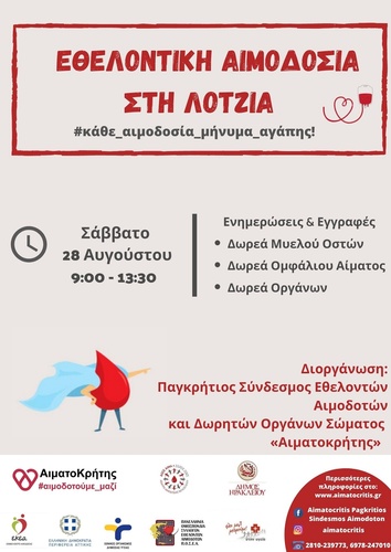 Εθελοντική Αιμοδοσία θα πραγματοποιηθεί το Σάββατο 28.08.2021 στο κέντρο της πόλης του Ηρακλείου (στο Αίθριο της Λότζια), από τις 09:00 έως τις 13:30. Πρόκειται για μια κοινή προσπάθεια αιμοδοσίας, την οποία συντονίζουν:
