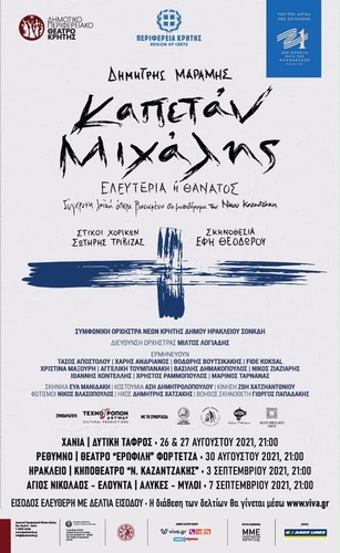 Η πρωτότυπη σύγχρονη λαϊκή όπερα «Καπετάν Μιχάλης» του συνθέτη Δημήτρη Μαραμή, βασισμένη στο εμβληματικό μυθιστόρημα του Νίκου Καζαντζάκη, αποτελεί την κεντρική παραγωγή της Περιφέρειας Κρήτης, για τον εορτασμό για τα 200 χρόνια από την Ελληνική Επανάσταση του 1821.