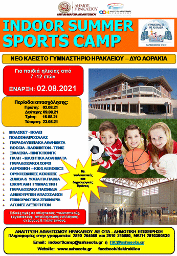 Ο Δήμος Ηρακλείου και η Ανάπτυξη Αθλητισμού Ηρακλείου ΑΕ ΟΤΑ, ενημερώνουν τους δημότες ότι το Indoor Summer Sports Camp 2021 που υλοποιείται με μεγάλη επιτυχία στο Νέο Κλειστό Γυμναστήριο Ηρακλείου (Δύο Αοράκια) θα συνεχίσει να λειτουργεί από 02.08 μέχρι και το τέλος του Αυγούστου (31-08-2021).