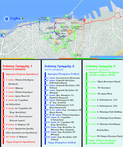 Να υπενθυμίσουμε ότι ήδη λειτουργούν δύο γραμμές Mini Bus, η κόκκινη γραμμή με αφετηρία το λιμάνι, η οποία εξυπηρετεί τους κατοίκους των ανατολικών περιοχών της πόλης και η μπλε γραμμή με αφετηρία το Παγκρήτιο Στάδιο, η οποία εξυπηρετεί τους κατοίκους των δυτικών περιοχών της πόλης.