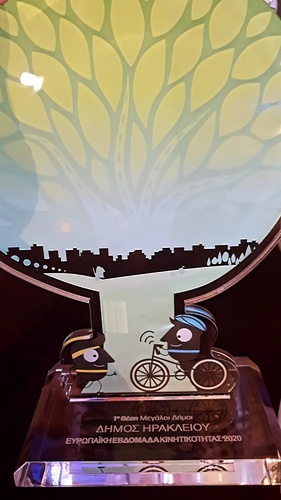 Με το 1ο βραβείο για τις δράσεις του στην Ευρωπαϊκή Εβδομάδα Κινητικότητας 2020 τιμήθηκε ο Δήμος Ηρακλείου την Πέμπτη 9 Σεπτεμβρίου. Το βραβείο αφορούσε στην κατηγορία των μεγάλων Δήμων της χώρας.