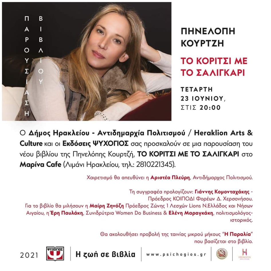 Το βιβλίο της Πηνελόπης Κουρτζή "Το Κορίτσι με το Σαλιγκάρι", εκδόσεις "Ψυχογιός", παρουσιάζεται την Τρίτη 23 Ιουνίου, στις 20.00, στο Cafe Marina. Στο πλαίσιο της παρουσίασης θα προβληθεί και η ταινία μικρού μήκους "Η Παραλία" που βασίζεται στο βιβλίο.