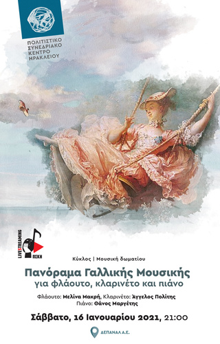 Το Σάββατο 16 Ιανουαρίου 2021, στις 21:00, τρεις διακεκριμένοι μουσικοί, η φλαουτίστα Μελίνα Μακρή, ο κλαρινετίστας Άγγελος Πολίτης και ο πιανίστας Θάνος Μαργέτης, ερμηνεύουν έργα των Maurice Emmanuel (1862-1938), Gabriel Fauré (1845-1924), Darius Milhaud (1892-1974), Francis Poulenc (1899-1963) και Camille Saint-Saëns (1835-1921), μεταφέροντας στη μεγάλη σκηνή της Αίθουσας “Ανδρέας και Μαρία Καλοκαιρινού”, την ατμόσφαιρα των έργων που χαρακτήρισαν την Γαλλική συνθετική γραφή κατά το πέρασμά της από τον Ρομαντισμό του 19ου αιώνα στις μουσικές φόρμες του 20ό αιώνα.