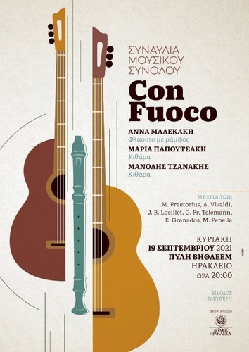 Με τη συναυλία μουσικού συνόλου «Con Fuoco» συνεχίζονται οι εκδηλώσεις «Ηράκλειο – Καλοκαίρι 2021» την Κυριακή 19 Σεπτεμβρίου στο Ανοικτό Θέατρο της Πύλης Βηθλεέμ.