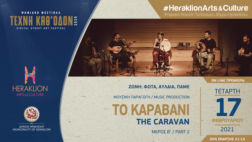 Το μουσικό σχήμα Καραβάνι έρχεται στο ψηφιακό κανάλι πολιτισμού του Δήμου Ηρακλείου με σκοπό να μας ταξιδέψει μέσα από τις μουσικές του στις "Πολλαπλές εκδοχές της μουσικής Κρήτης". Το δεύτερο μέρος της μουσικής παράστασης που εντάσσεται στο πλαίσιο του ψηφιακού φεστιβάλ «Τέχνη Καθ’ Οδόν» 2020 μπορείτε να το παρακολουθήσετε σε On line πρεμιέρα τη Τετάρτη 17 Φεβρουαρίου 2021 στον παρακάτω σύνδεσμο: https://youtu.be/--WLFnqomCQ.