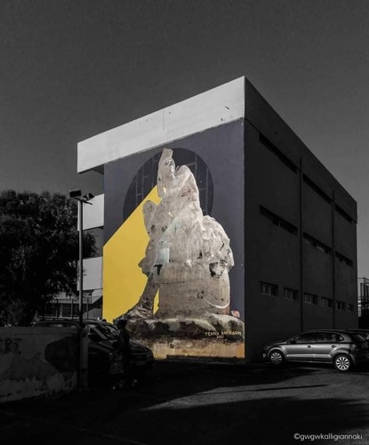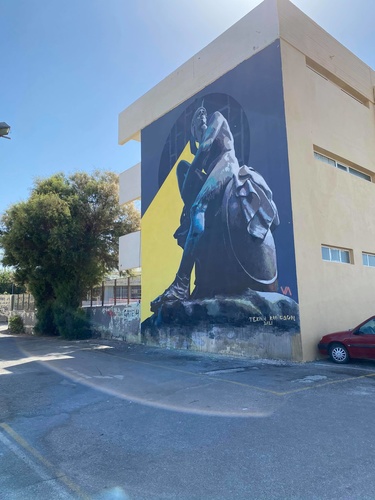 Εντυπωσιάζει η νέα τοιχογραφία με θέμα τον «Θησέα» στο σχολικό συγκρότημα «Τάλως» η όποια δημιουργήθηκε στο πλαίσιο του Φεστιβάλ «Τέχνη Καθ’ Οδόν» 2021 από την καλλιτεχνική ομάδα VV Crew.