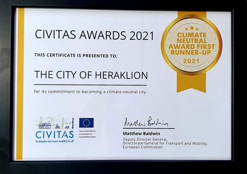 Το Ηράκλειο επελέγη ως φιναλίστ για το βραβείο «CIVITAS Climate – Neutral Award 2021», μία αναγνώριση που αφορά σε πόλεις οι οποίες υλοποιούν έργα για την ενίσχυση της κλιματικής ουδετερότητας στον τομέα των μεταφορών. Στην ίδια κατηγορία την πρώτη θέση πήρε ο Δήμος της Πάρμα και την τρίτη ο Δήμος Βάρης – Βούλας – Βουλιαγμένης.