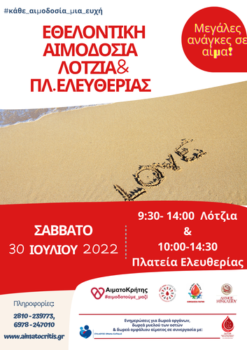 Διπλή εθελοντική αιμοδοσία θα πραγματοποιηθεί το Σάββατο 30/07/2022 στο κέντρο της πόλης του Ηρακλείου και συγκεκριμένα στο αίθριο της Λότζια απο τις 9:30 έως τις 14:00 και στην πλατεία Ελευθερίας από τις 10:00 έως τις 14:30.
