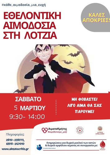 Εθελοντική αιμοδοσία θα πραγματοποιηθεί το Σάββατο 05/03/2022 στο κέντρο της πόλης του Ηρακλείου (στο Αίθριο της Λότζια), από τις 09:30 έως τις 14:00.