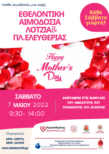 Διπλή εθελοντική αιμοδοσία θα πραγματοποιηθεί το Σάββατο 07/05/2022 στο κέντρο της πόλης του Ηρακλείου και συγκεκριμένα στο αίθριο της Λότζια και στην πλατεία Ελευθερίας ,  από τις 09:30 έως τις 14:00.