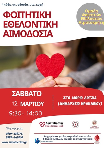 Εθελοντική αιμοδοσία θα πραγματοποιηθεί το Σάββατο 12/03/2022 στο κέντρο της πόλης του Ηρακλείου (στο Αίθριο της Λότζια),  από τις 09:30 έως τις 14:00.
