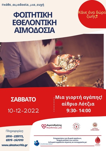 Εθελοντική αιμοδοσία θα πραγματοποιηθεί το Σάββατο 10/12/2022 στο κέντρο της πόλης του Ηρακλείου και συγκεκριμένα στο αίθριο της Λότζια απο τις 9:30 έως τις 14:00 .