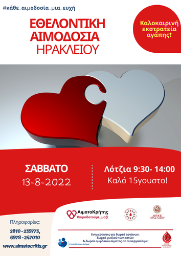 Πρόκειται για μια κοινή προσπάθεια αιμοδοσίας, την οποία διοργανώνει ο Παγκρήτιος Σύνδεσμος Εθελοντών Αιμοδοτών και Δωρητών Οργάνων Σώματος «Αιματοκρήτης» σε συνεργασία με τον Δήμο Ηρακλείου και την Αντιδημαρχία Πολιτισμού – Εθελοντισμού.