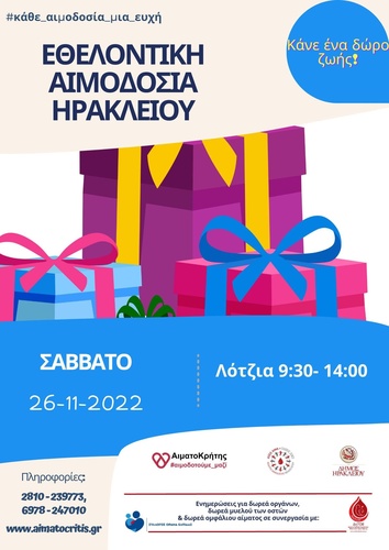 Εθελοντική αιμοδοσία θα πραγματοποιηθεί το Σάββατο 26/11/2022 στο κέντρο της πόλης του Ηρακλείου και συγκεκριμένα στο αίθριο της Λότζια από τις 9:30 έως τις 14:00 .