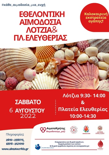 Διπλή εθελοντική αιμοδοσία θα πραγματοποιηθεί το Σάββατο 06/08/2022 στο κέντρο της πόλης του Ηρακλείου και συγκεκριμένα στο αίθριο της Λότζια απο τις 9:30 έως τις 14:00 και στην πλατεία Ελευθερίας από τις 10:00 έως τις 14:30.