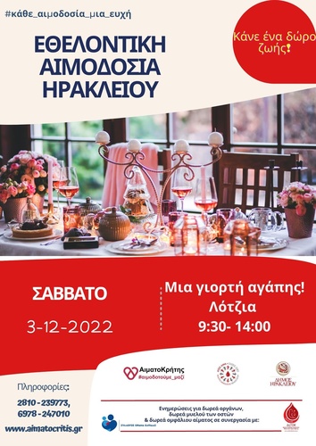 Εθελοντική αιμοδοσία θα πραγματοποιηθεί το Σάββατο 03/12/2022 στο κέντρο της πόλης του Ηρακλείου και συγκεκριμένα στο αίθριο της Λότζια από τις 9:30 έως τις 14:00 .