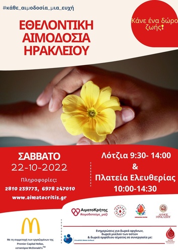 Διπλή εθελοντική αιμοδοσία θα πραγματοποιηθεί το Σάββατο 22/10/2022 στο κέντρο της πόλης του Ηρακλείου και συγκεκριμένα στο αίθριο της Λότζια απο τις 9:30 έως τις 14:00  και στην πλατεία Ελευθερίας  από τις 10:00 έως τις 14:30.