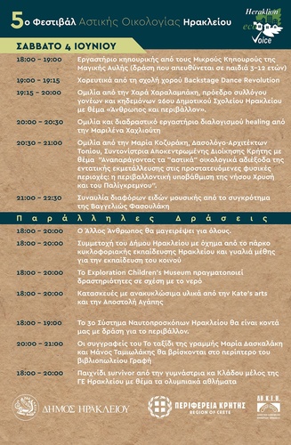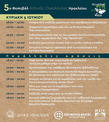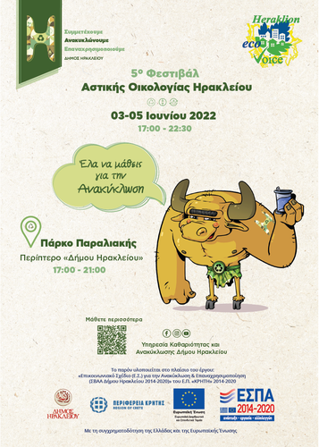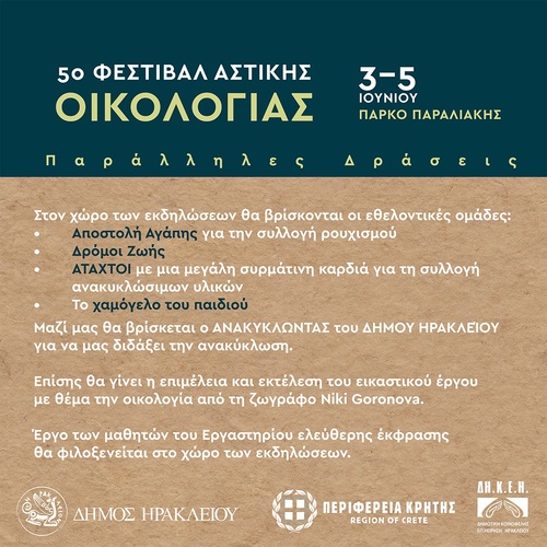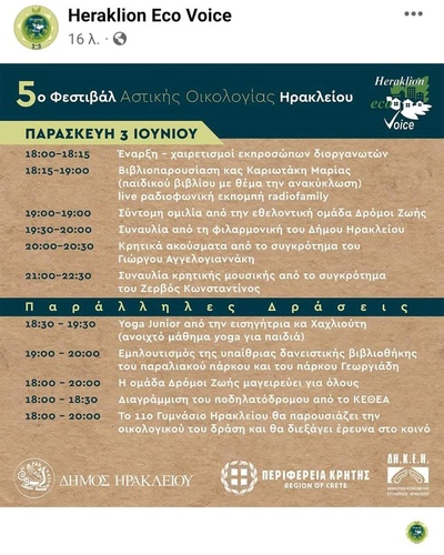 Με αφορμή την Παγκόσμια Ημέρα Περιβάλλοντος που εορτάζεται κάθε χρόνο στις 5 Ιουνίου, ο Δήμος Ηρακλείου, μέσω της Αντιδημαρχίας Κυκλικής Οικονομίας και Περιβάλλοντος, συμμετέχει στο 5ο Φεστιβάλ Αστικής Οικολογίας που διοργανώνει η εθελοντική ομάδα HeraklionEcoVoice με συνδιοργανώτρια την ΔΗ.Κ.Ε.Η., από τις 3 έως τις 5 Ιουνίου, στον Καράβολα Ηρακλείου.
