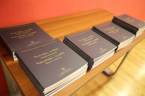Η επιμελήτρια της έκθεσης Λουίζα Καραπιδάκη παρουσίασε τα τρία λευκώματα με τον τίτλο «Τα εν οίκω εν δήμω» που έχει εκδώσει ο Δήμος Ηρακλείου και στα οποία περιλαμβάνονται έργα της δημοτικής συλλογής. Τα λευκώματα δίδονται δωρεάν στο κοινό, στον χώρο της έκθεσης.