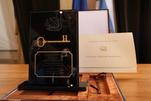 Τον τίτλο του Επίτιμου Δημότη καθώς και το «Κλειδί» της πόλης απένειμε στον μεγάλο καλλιτέχνη ο Δήμαρχος Ηρακλείου Βασίλης Λαμπρινός, ο οποίος στον σύντομο χαιρετισμό του ανέφερε: