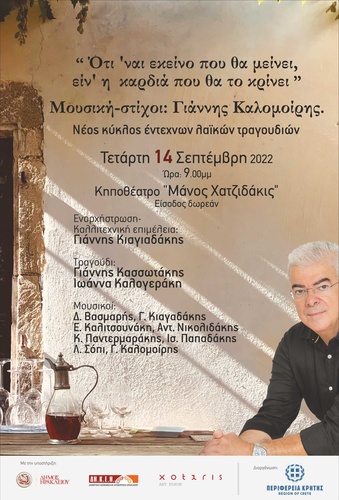 Την Τετάρτη στις 14 Σεπτεμβρίου 2022 και ώρα 9.00μμ στο κηποθέατρο  ''Μάνος Χατζιδάκις'' θα  λάβει χώρα η μουσική παράσταση με τίτλο: ''Ότι ειν΄εκείνο που θα μείνει είναι η καρδιά που θα το κρίνει''. Παρουσιάζονται σε πρώτη εκτέλεση, 15 Ελληνικά τραγούδια σε στίχους και μουσική του Γιάννη Καλομοίρη.