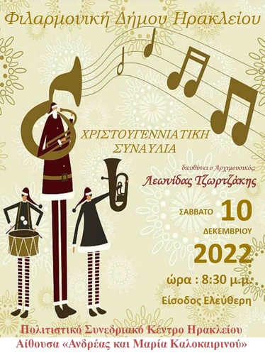 Το Σάββατο 10 Δεκεμβρίου στις 20:30 θα πραγματοποιηθεί η καθιερωμένη χριστουγεννιάτικη συναυλία της Φιλαρμονικής του Δήμου Ηρακλείου, στην αίθουσα «Ανδρέας και Μαρία Καλοκαιρινού» του Πολιτιστικού και Συνεδριακού Κέντρου Ηρακλείου, με ελεύθερη είσοδο για το κοινό. Η συναυλία περιλαμβάνει χαρούμενες εορταστικές μελωδίες και κομμάτια από το διεθνές ρεπερτόριο. Διευθύνει ο Αρχιμουσικός Λεωνίδας Τζωρτζάκης.