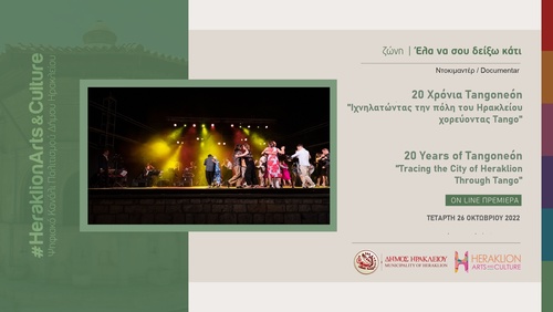 Ο σύλλογος Tangoneon με αφορμή τη συμπλήρωση 20 χρόνων από την ίδρυση του παρουσιάζει το ντοκιμαντέρ «Ιχνηλατώντας την πόλη του Ηρακλείου χορεύοντας Tango» στο διαδικτυακό κανάλι πολιτισμού του Δήμου Ηρακλείου Heraklion Arts and Culture!