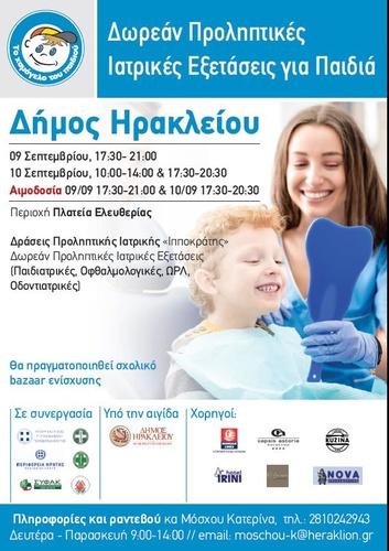 Την Παρασκευή 9 και το Σάββατο 10 Σεπτεμβρίου 2022, στο πλαίσιο της Δράσης Προληπτικής Ιατρικής / Οδοντιατρικής «ΙΠΠΟΚΡΑΤΗΣ» που υλοποιεί ο Οργανισμός «Το Χαμόγελο του Παιδιού» από το 2002, θα πραγματοποιηθούν δωρεάν προληπτικές παιδιατρικές, οδοντιατρικές, οφθαλμολογικές και ωτορινολαρυγγολογικές εξετάσεις σε παιδιά/μαθητές, Δράση Εθελοντικής Αιμοδοσίας, καθώς και Σχολικό Bazaar Ενίσχυσης του Οργανισμού, στην Πλατεία Ελευθερίας του Δήμου Ηρακλείου.