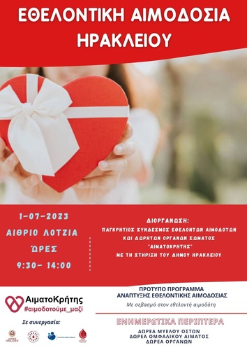 Πρόκειται για μια κοινή προσπάθεια αιμοδοσίας, την οποία διοργανώνει ο Παγκρήτιος Σύνδεσμος Εθελοντών Αιμοδοτών και Δωρητών Οργάνων Σώματος «Αιματοκρήτης», σε συνεργασία με τον Δήμο Ηρακλείου .