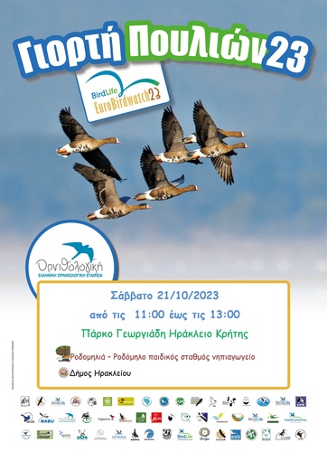 Με αφορμή την Ευρωπαϊκή Γιορτή των Πουλιών (EuroBirdwatch) 2023, ο Παιδικός Σταθμός / Νηπιαγωγείο Ροδομηλιά και ο Δήμος Ηρακλείου, αποκρινόμενοι στο κάλεσμα της Ελληνικής Ορνιθολογικής Εταιρείας, καλούν τα παιδιά και τους γονείς τους στο Πάρκο Γεωργιάδη, στην καρδιά της πόλης του Ηρακλείου.