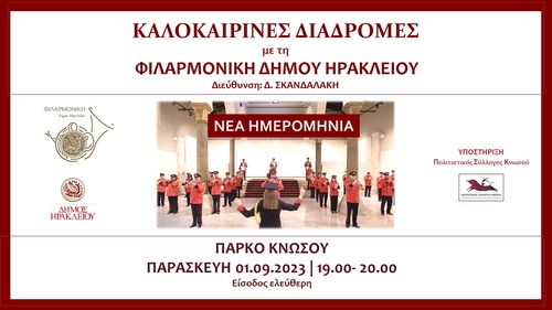 Η Φιλαρμονική του Δήμου Ηρακλείου συνεχίζει τις εμφανίσεις την Παρασκευή 1η Σεπτεμβρίου στο Πάρκο Κνωσού. Μετά από πρόκληση του τοπικού Πολιτιστικού Συλλόγου θα παίξει γνωστές και χαρούμενες μελωδίες για το κοινό.