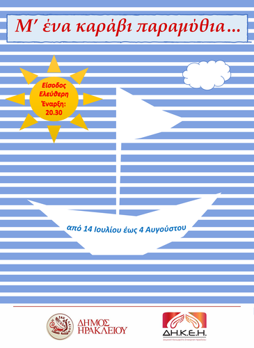 «Μ’ ένα καράβι παραμύθια» «ταξιδεύουν» και  αυτό το καλοκαίρι ο Δήμος Ηρακλείου και η Δημοτική Κοινωφελής Επιχείρηση Πολιτισμού, Περιβάλλοντος και Κοινωνικής Πρόνοιας Ηρακλείου (ΔΗ.Κ.Ε.Η) προκειμένου να προσφέρουν όμορφες βραδιές στα παιδιά της πόλης αλλά και της περιφέρειας του Δήμου.