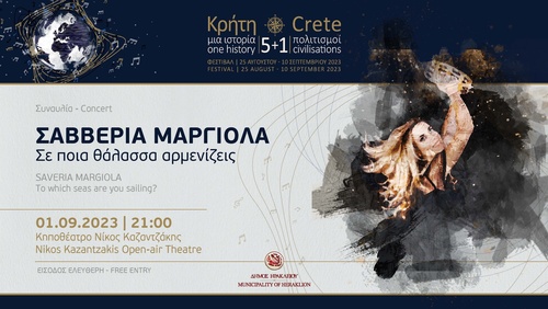 Συνεχίζεται το Φεστιβάλ του Δήμου Ηρακλείου «Κρήτη μια Ιστορία, 5+1 Πολιτισμοί» την Παρασκευή 1η Σεπτεμβρίου με την συναυλία της Σαββέριας Μαργιολά στο κηποθέατρο «Νίκος Καζαντζάκης».