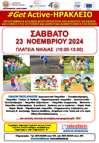 Η πρώτη δράση του #Get Active-Ηράκλειο θα πραγματοποιηθεί το Σάββατο 23 Νοεμβρίου στην Πλατεία Νικαίας από τις 10 το πρωί έως τη 1 το μεσημέρι. Διαγωνιστικά Παιχνίδια, τσουβαλοδρομίες, παιχνίδια γονέων & παιδιών, παραολυμπιακά παιχνίδια, διελκυστίνδα, σκυταλοδρομία, παιχνίδια δεξιοτήτων, ισορροπίας, ακρίβειας, ποδοσφαίρου  & μπάσκετ, δράσεις για το πράσινο, super goal και super shots, παραδοσιακά παιχνίδια αλλά και ενημερωτικές συζητήσεις για την άσκηση, τη διατροφή, τις πρώτες βοήθειες, και την ασφάλεια στην πόλη και στο νερό είναι μεταξύ των δραστηριοτήτων που παιδιά, γονείς και συγγενείς ανεξάρτητα από τη φυσική τους κατάσταση θα μπορούν να χαρούν. Στο #Get Active-Ηράκλειο του Σαββάτου θα συνδράμουν το Τμήμα Τροχαίας της Ελληνικής Αστυνομίας, το Λιμεναρχείο Ηρακλείου και ο Τομέας των Σαμαρειτών του Ελληνικού Ερυθρού Σταυρού.