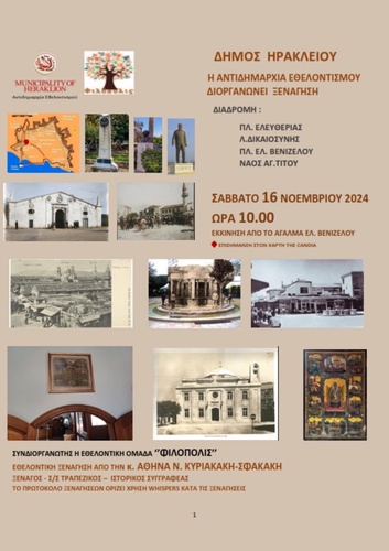Με αμείωτο ρυθμό και έντονο ενδιαφέρον συμμετοχής, συνεχίζονται οι «Χαρτοδιαδρομές… στο Δήμο μας» στο πλαίσιο του δεύτερου κύκλου των δωρεάν ξεναγήσεων που εγκαινίασε ο Δήμος Ηρακλείου μέσω της Αντιδημαρχίας Εθελοντισμού σε συνεργασία με την Ομάδα «Φιλόπολις» και την εθελοντική προσφορά της ξεναγού Αθηνάς Κυριακάκη - Σφακάκη.