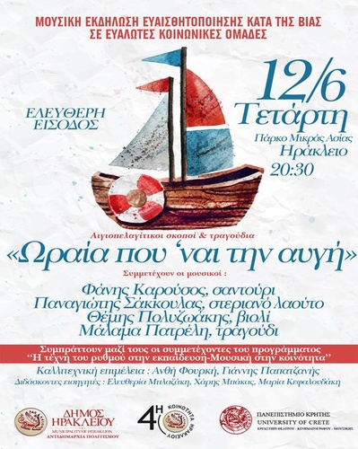 Μουσική εκδήλωση ευαισθητοποίησης κατά της βίας με τίτλο ''Ωραία που' ναι την αυγή'' θα πραγματοποιηθεί την Τετάρτη 12 Ιουνίου στις 20:30 στο Πάρκο Μικράς Ασίας από τους συμμετέχοντες του προγράμματος ''Η τέχνη του ρυθμού στην εκπαίδευση - Μουσική στην κοινότητα'' του Δήμου Ηρακλείου, που υλοποιεί το Εργαστήρι Θεάτρου-Κινηματογράφου-Μουσικής του Πανεπιστημίου Κρήτης, σε συνεργασία με τον Δήμο Ηρακλείου, την Αντιδημαρχία Πολιτισμού Ηρακλείου και την 4η Δημοτική Κοινότητα Ηρακλείου.