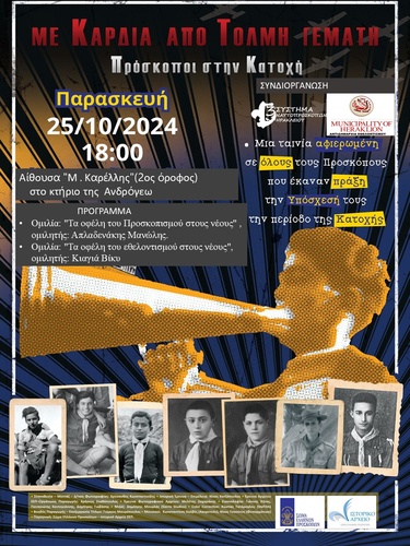 - Προβολή ντοκιμαντέρ-ταινίας μικρού μήκους "Με καρδιά από τόλμη γεμάτη. Οι Πρόσκοποι στην Κατοχή", με θέμα την δράση των Προσκόπων