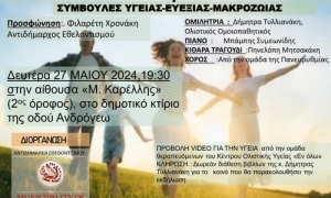 Μια ενδιαφέρουσα εκδήλωση με συμβουλές για καλύτερη υγεία, ευεξία και μακροζωία οργανώνει η Αντιδημαρχία Εθελοντισμού τη Δευτέρα 27 Μαΐου 2024 στις 19.30 το απόγευμα στην αίθουσα "Μανόλης Καρέλλης" στο κτίριο της Ανδρόγεω.
