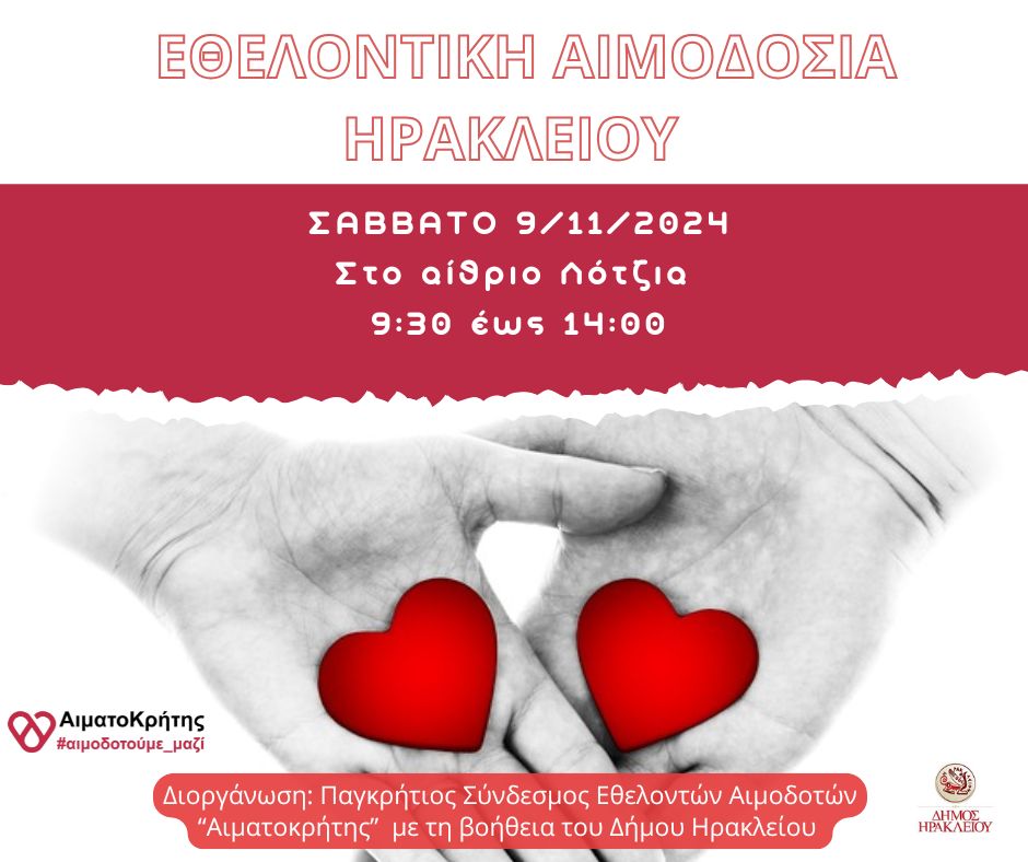 Το Σάββατο 9 Νοεμβρίου 2024 θα πραγματοποιηθεί εθελοντική αιμοδοσία στο κέντρο της πόλης του Ηρακλείου και συγκεκριμένα στο αίθριο της Λότζια από τις 09:30 έως τις 14:00.