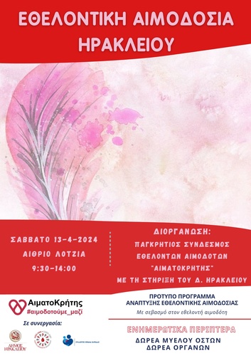 Το Σάββατο 13/04/2024 και θα πραγματοποιηθεί εθελοντική αιμοδοσία στο κέντρο της πόλης του Ηρακλείου και συγκεκριμένα στο αίθριο της Λότζια από τις 9:30 έως τις 14:00.