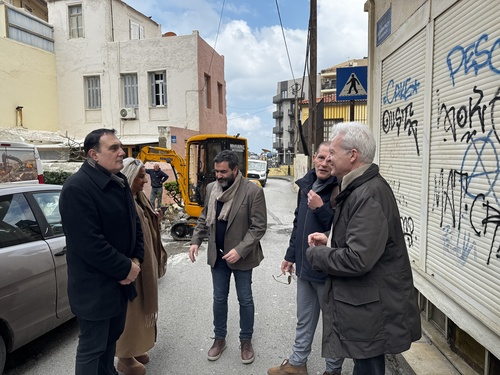 Αυτοψία στις πρώτες εργασίες του έργου ανάπλασης της οδού Δελημάρκου και κάθετων οδών της στην Αγία Τριάδα, πραγματοποίησε ο Δήμαρχος Ηρακλείου Αλέξης Καλοκαιρινός, μαζί με τον Αντιδήμαρχο Τεχνικών Υποδομών & Βιώσιμης Κινητικότητας Γιώργο Σισαμάκη, τον επιβλέποντα του έργου Γιώργο Ταβερναράκη και την Πρόεδρο της 1ης Δημοτικής Κοινότητας Θεοδοσία Αγγελιδάκη.